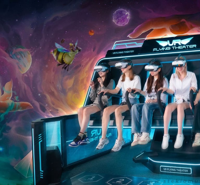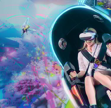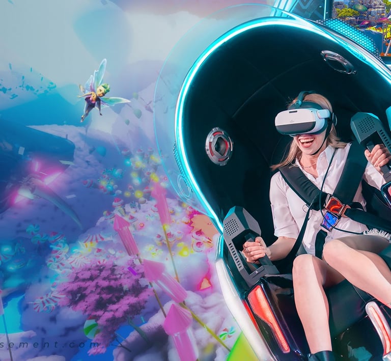 Space travel in another world with our Flying Theatre, experience 360 roller coaster in our VR egg or get to race in our cyberpunk VR racing cars.